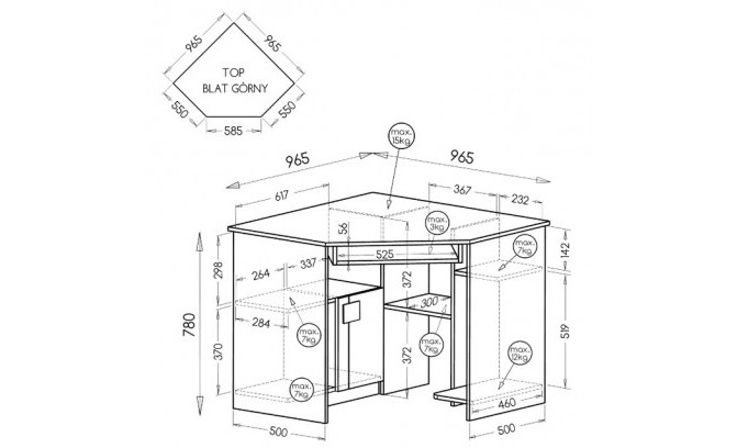 Izmēri 96, 5x96, 5x78 cm nodrošina ērtu vietu studijām un darbam.