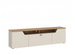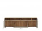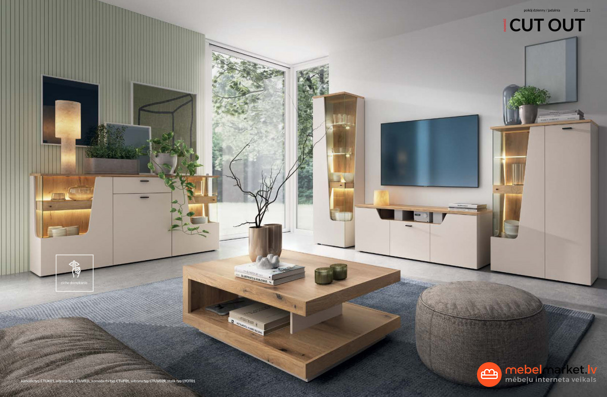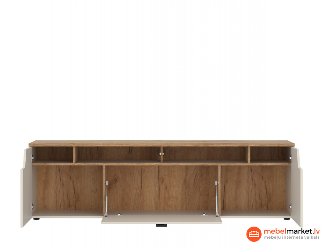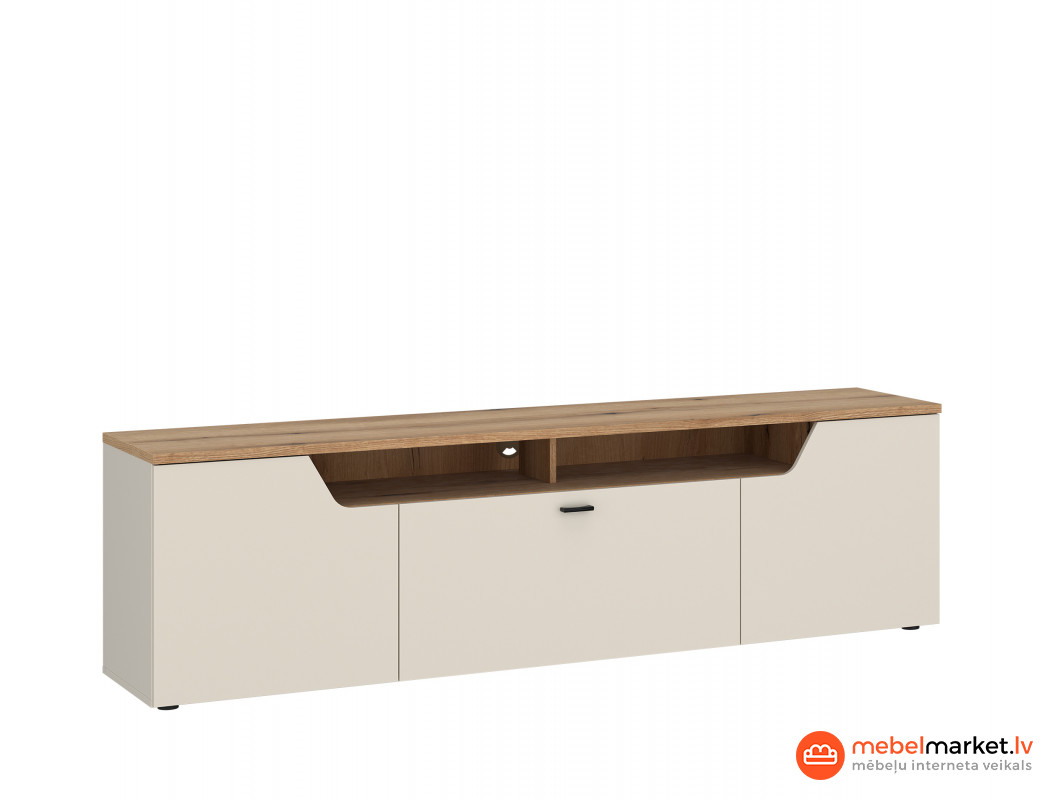 Ar pietiekamu uzglabāšanas vietu, kuras izmērs ir 195 cm plats, 56,5 cm augsts un 45 cm dziļš, CUT OUT kumode satur visus nepieciešamos RTV piederumus. Tā iekšpusē viegli ietilps DVD, tālvadības pultis vai kontrolieri, kā arī citi sīkumi, kurus vēlaties vienmēr turēt pie rokas. Pateicoties iespējai slēpt priekšmetus, šī mēbele ļauj uzturēt kārtību, kas ir atslēga jebkurā mājā.