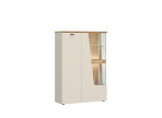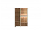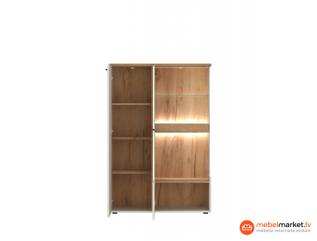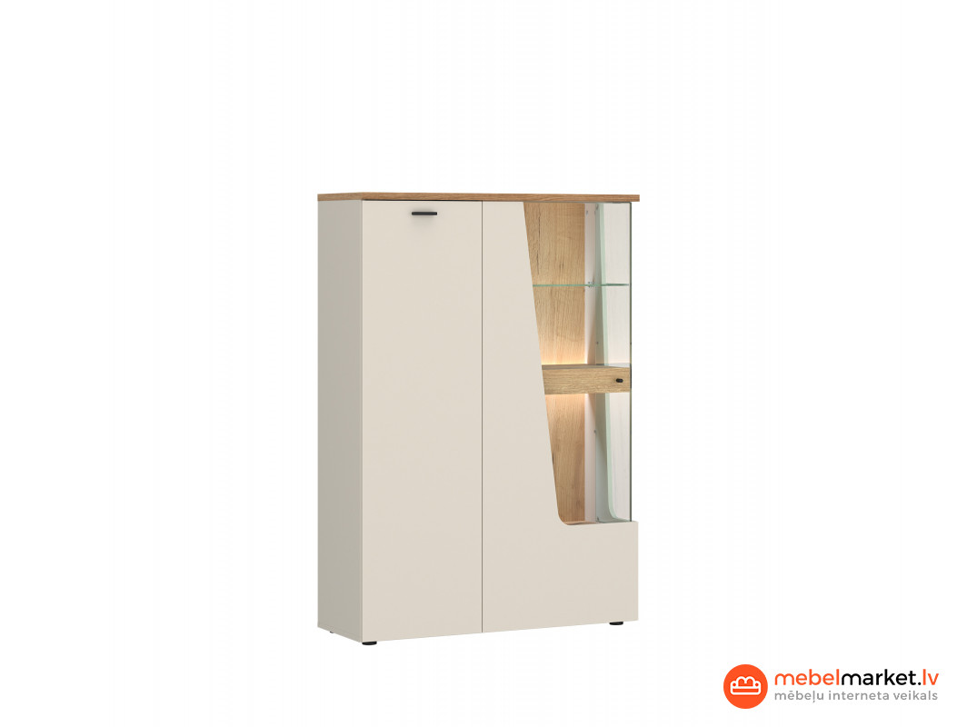 CUT OUT atšķirīgā iezīme ir tās divas veramās durvis, kas paver elegantus stikla plauktus, kas ir ideāli piemēroti jūsu iecienītāko rotājumu, fotogrāfiju un literatūras demonstrēšanai. Diagonālā asimetriskā Puse piešķir mēbelei modernu un svaigu izskatu, un melnie rokturi un kājas lieliski sader ar visu, izceļot tās moderno stilu. Papildu priekšrocība ir iespēja uzstādīt apgaismojumu, kas atdzīvinās un parādīs elegantos dekoratīvos elementus, kas atrodas iekšpusē.
