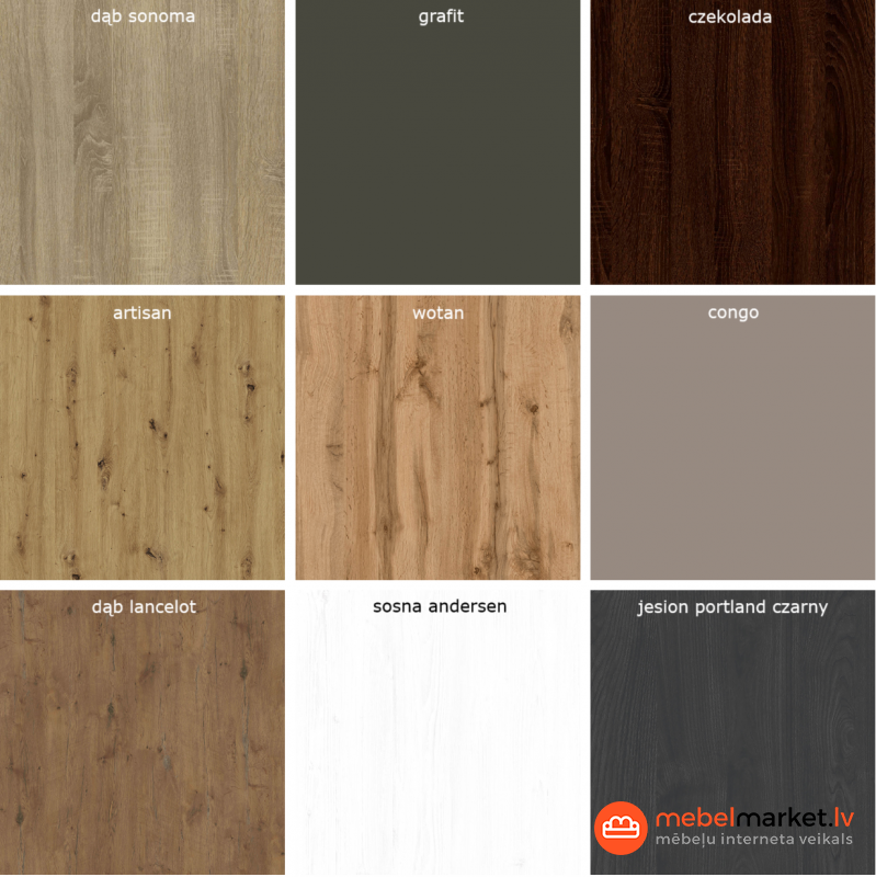 Papildinformācija: sistēma ir izgatavota no augstas kvalitātes laminētas plātnes, malas ir pabeigtas ar ABS finieri, Mēbeles ir pieejamas dažādās krāsu kombinācijās.