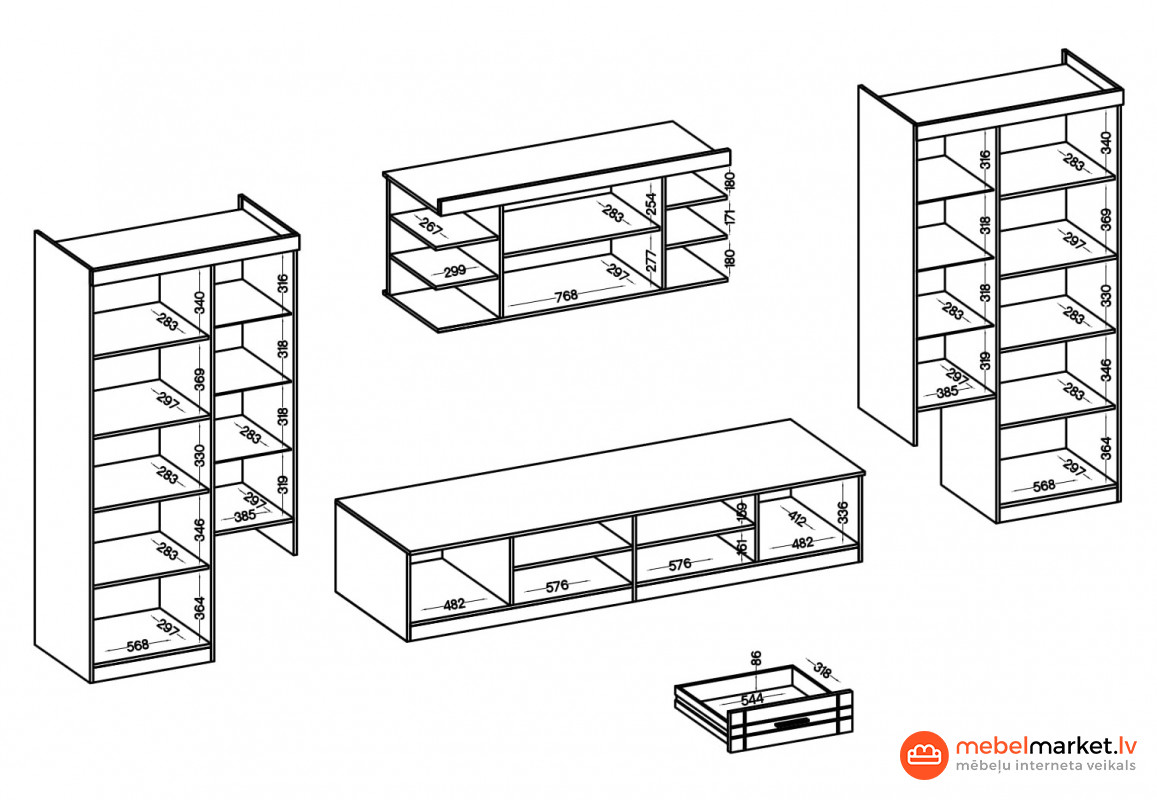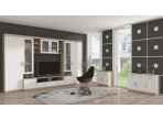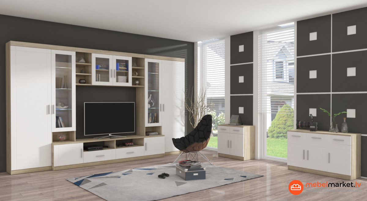 Šis modernais mēbeļu komplekts ir ideāli piemērots lielai viesistabai vai atpūtas zonai: ietilpīgos skapjos ar plauktiem būs visas nepieciešamās lietas, un Televizora skapis ļaus ērti skatīties filmas kopā ar ģimeni vai draugiem.