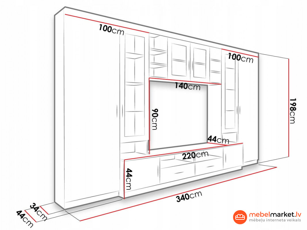 Izmērs:- Augstums 197,5 cm- Platums 340 cm - Dziļums 44 cm