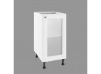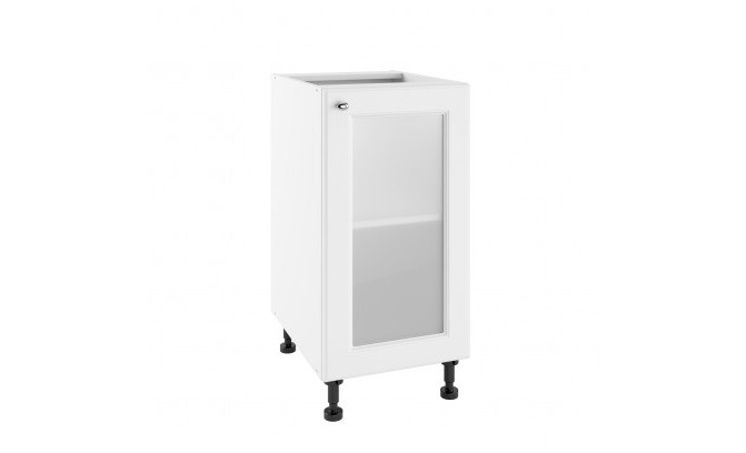 Bāzes skapis ar stikla priekšpusi ir gan funkcionāla, gan dekoratīva mēbele. Tās korpuss ir izgatavots no mēbeļu plātnes (16 mm biezs), un priekšpuse ir 19 mm MDF plātnes un piena stikla kombinācija.