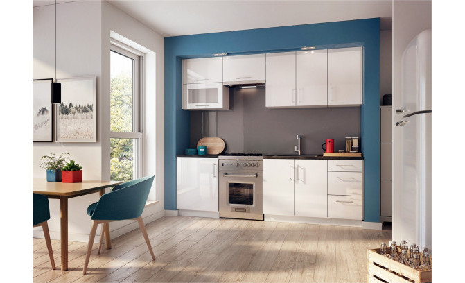 Piedāvātā modeļa korpuss sastāv no augstas kvalitātes skaidu plātnes, un priekšējā daļa ir stiklota ar izturīgu opāla stiklu. Tāpat kā visos Luna komplektos, jūs atradīsit arī metāla rokturus, kā arī eņģes un sliedes ar mīksta aizvēršanas sistēmu.Mēbeles ir komplektētas ar vācu furnitūru ECO BLUM.