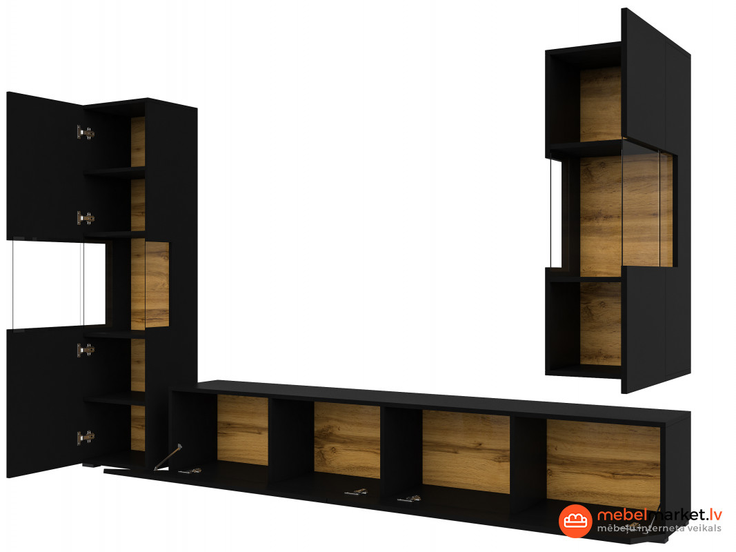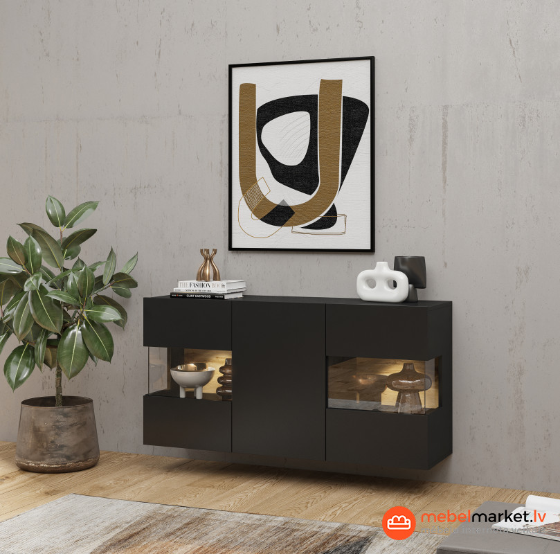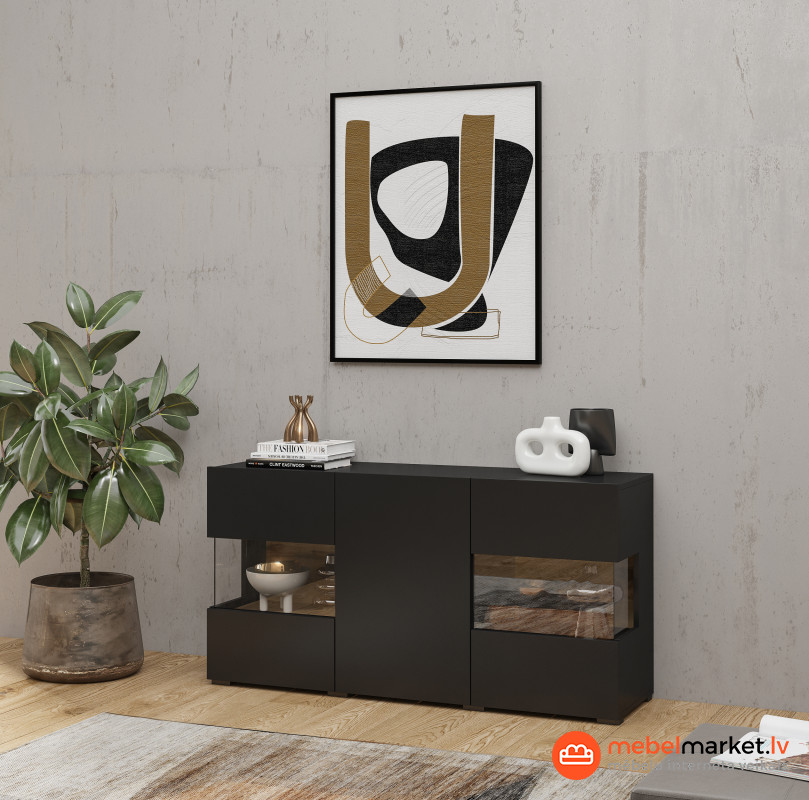 Уникальная конструкция без ручек с современной системой открывания «нажми и открывай» гарантирует удобство использования. Трёхдверная витрина со стеклянным фасадом, дополненная шестью практичными полками, — это не только стильное, но и функциональное место для хранения. Изящная отделка и выступающие фасады не только добавляют элегантности, но и чрезвычайно практичны.