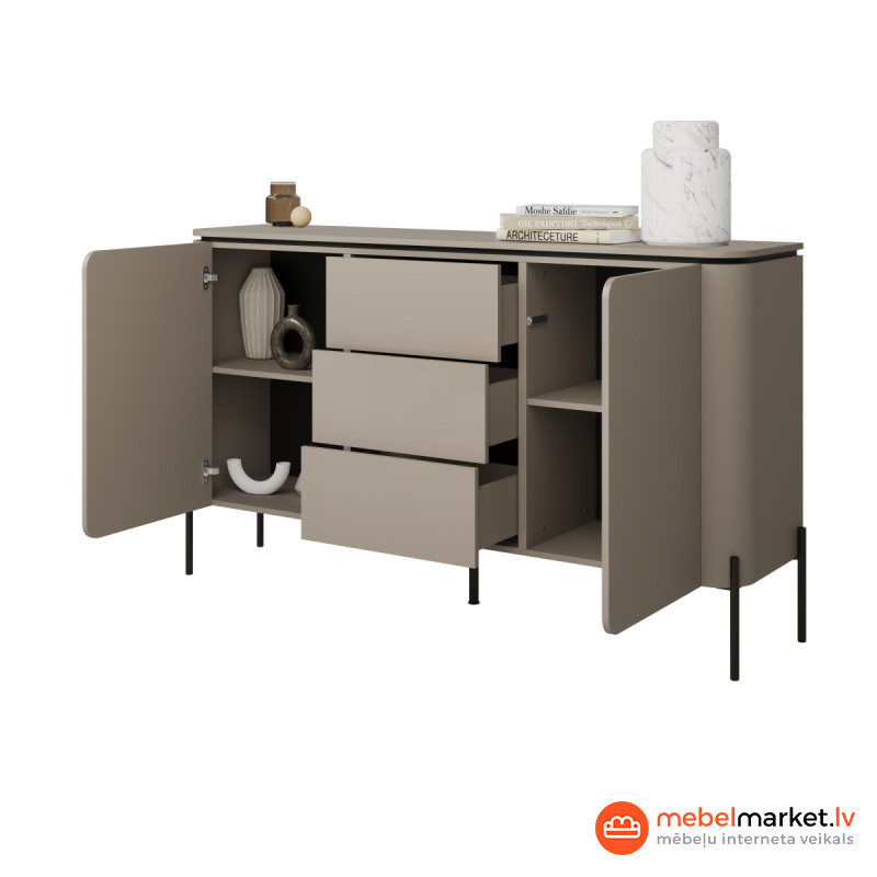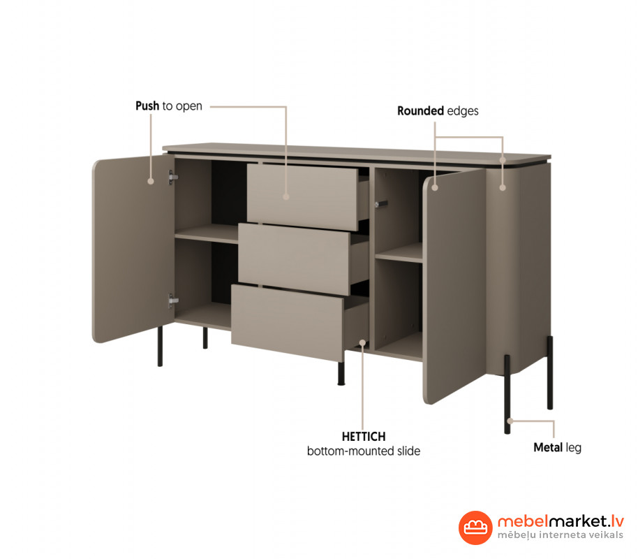 Комод Bello не только красив, но и практичен. Благодаря трём вместительным ящикам и двум просторным дверцам он обеспечит достаточно места для хранения ваших любимых вещей. Удобная система открывания Push-to-Open обеспечивает невероятно лёгкий доступ к внутреннему пространству, делая повседневное использование ещё более комфортным.