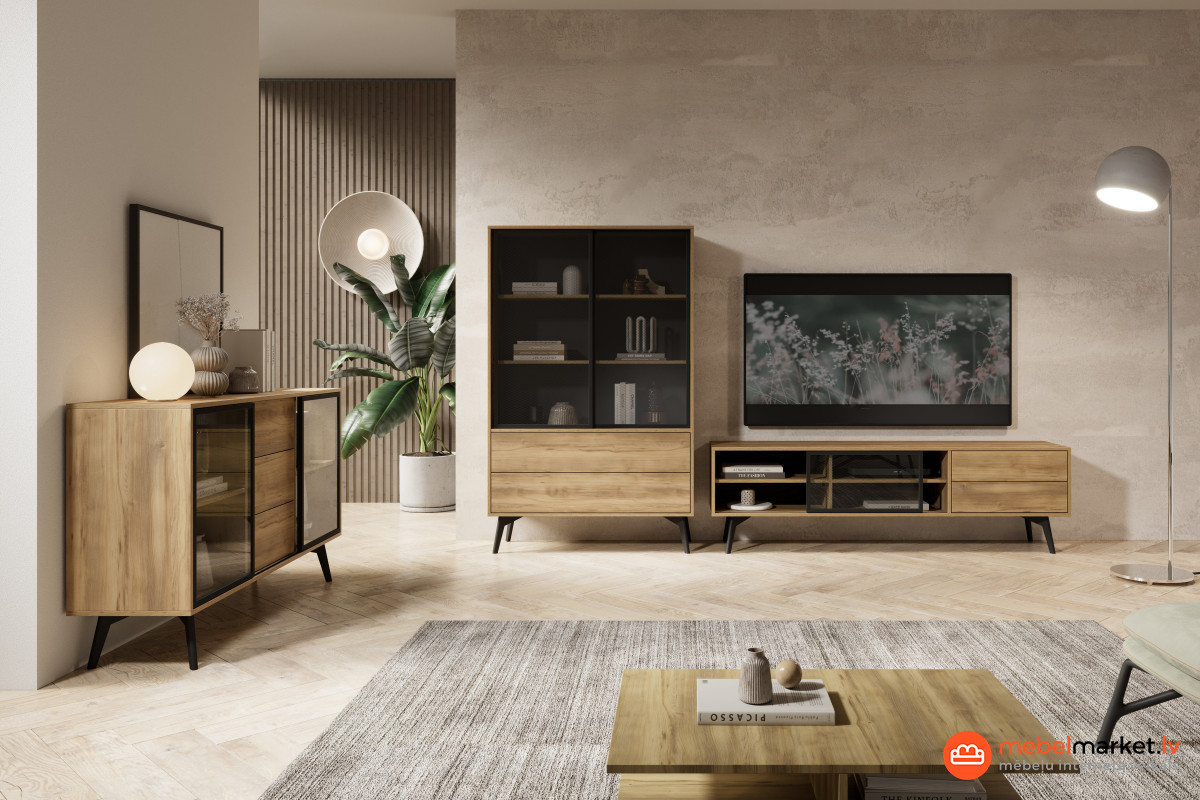 Коллекция Slide сочетает в себе естественное тепло и современный дизайн. Отделка из барочного дуба золотистого оттенка создает уютную атмосферу, располагающую к отдыху. Черные акценты подчеркивают глубину дерева и выделяют структуру волокон и узлов, придавая мебели отличительный характер. Комод, витрина и тумба под телевизор идеально вписываются в современные и промышленные жилые помещения, сочетая функциональность с элегантностью.