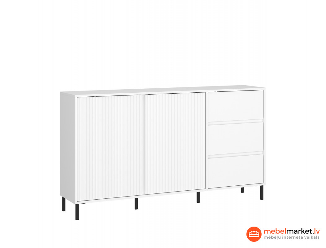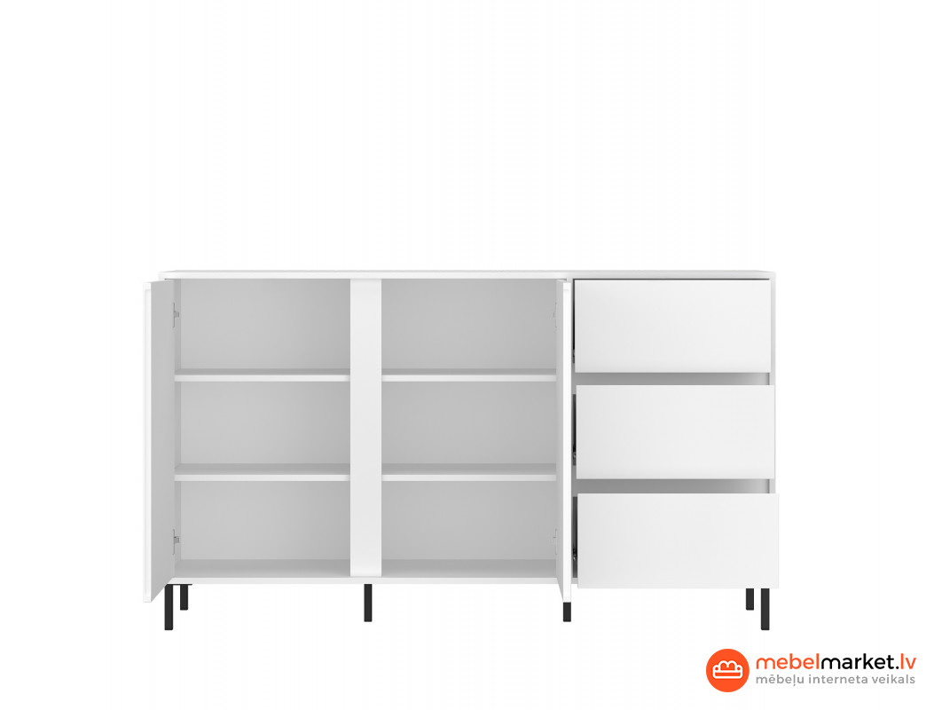 Размеры 157,8 x 91,6 x 40 см скрывают продуманную систему хранения: за двумя дверцами с доводчиками четыре ровные полки удобно разместят коллекцию виниловых пластинок, коробки с конструкторами или запас ароматических свечей. Три широких ящика на направляющих полного выдвижения плавно выдвигаются до предела, обеспечивая достаточно места для хранения альбомов, спортивных принадлежностей или хозяйственных инструментов. Металлические ножки приподнимают корпус на 12 см, поэтому робот-пылесос не обходит мебель, а легко проезжает под ней.