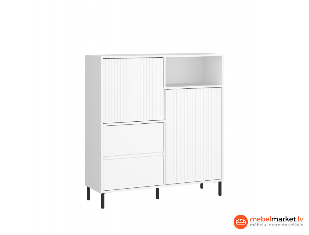 Белый комод AVENALE AVEK03 – функциональный предмет мебели с выразительным современным характером. Сочетание простых линий, декоративных рифленых фасадов и лёгкого блеска придаёт ему элегантный вид, идеально соответствующий современным тенденциям дизайна интерьера. Компактные размеры (ширина 105,4 см, высота 117,2 см) и лёгкая конструкция на чёрных металлических ножках делают его универсальным решением для небольших интерьеров – гостиных, детских комнат, домашних офисов и столовых. Ножки не только подчёркивают современный характер комода, но и позволяют роботу-уборщику свободно перемещаться под ним (высота робота составляет 12 см). Это практичное решение позволяет поддерживать порядок, не передвигая комод.