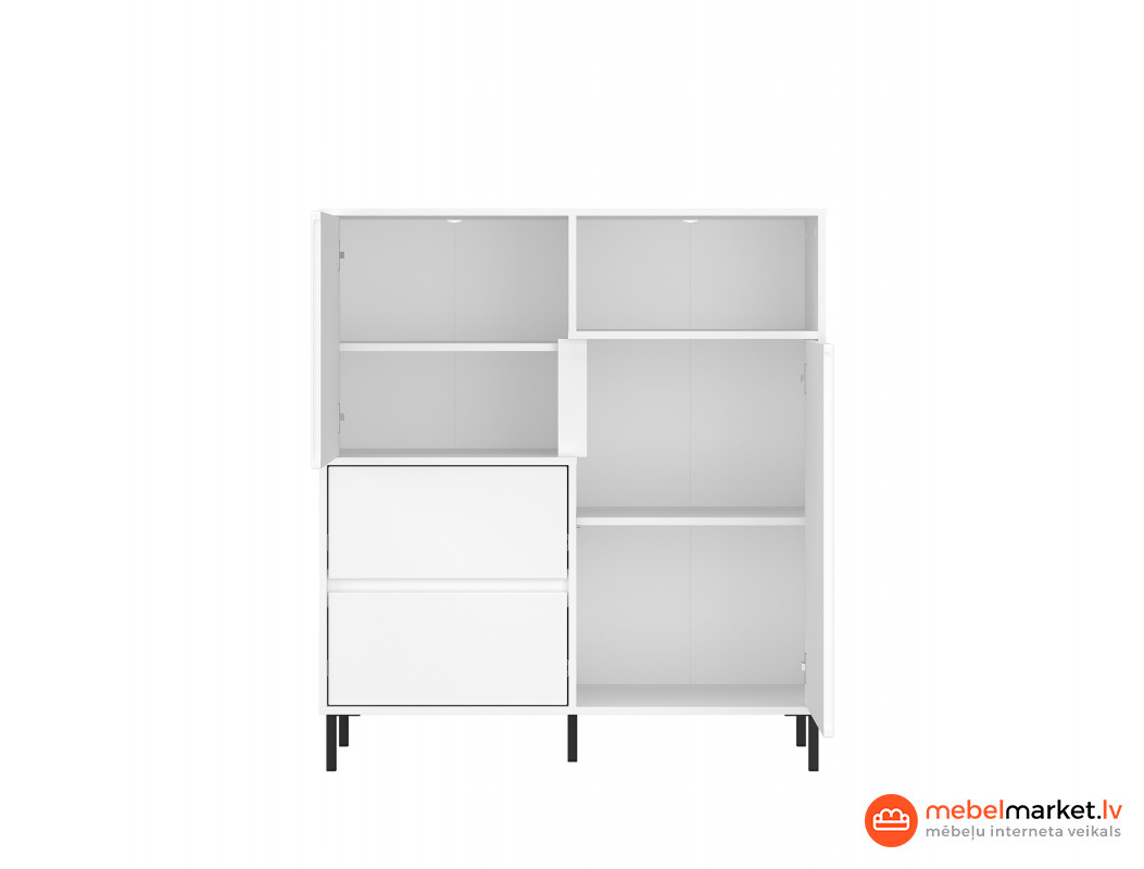 Комод оснащён множеством практичных функций. Два вместительных ящика на шариковых направляющих полного выдвижения позволяют организовать хранение документов, аксессуаров и текстиля. За откидными фасадами скрываются вместительные полки для крупногабаритных предметов или хозяйственных принадлежностей. Открытая ниша идеально подходит для хранения украшений, книг и мелкой электроники. Система плавного закрывания дверей повышает комфорт использования. Отсутствие традиционных ручек и наличие удобных углублений на фасадах подчёркивают простой, но изысканный дизайн. Корпус изготовлен из ламинированного ДСП, а фасады – из МДФ, что обеспечивает долговечность и лёгкость в уходе.