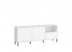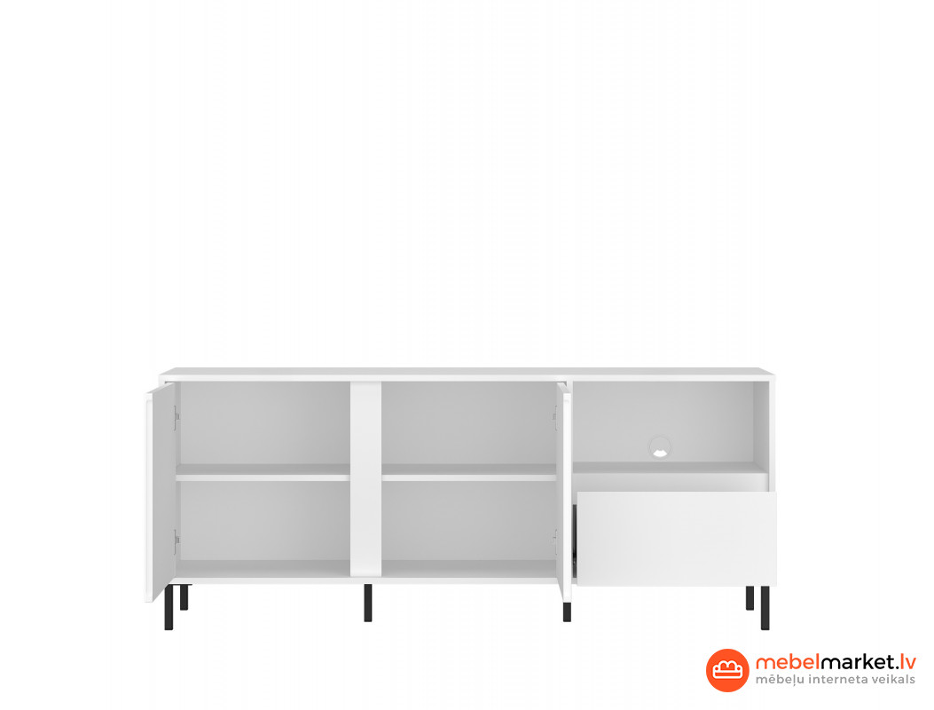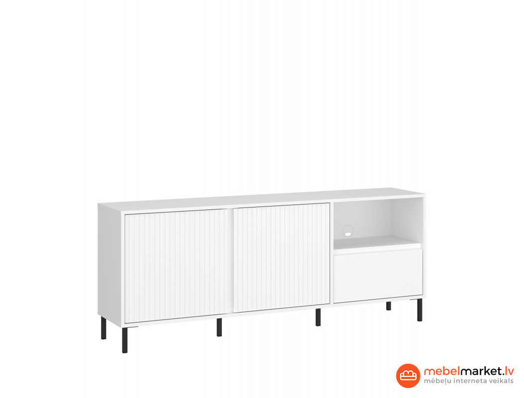 Откройте для себя тумбу под телевизор AVENALE глянцево-белого цвета от Meble Wójcik! Две доводчики, открытая ниша и вместительный ящик — идеальный способ организовать все необходимое. Тонкие чёрные ножки добавляют лёгкости.